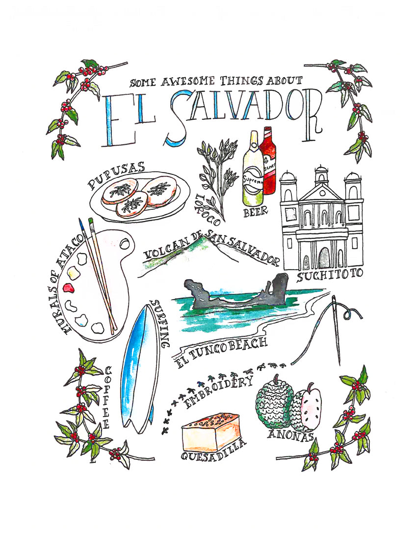 - ARTISTIC DESIGN: Hand-drawn illustrations celebrating El Salvador's culture and heritage through detailed sketches and watercolor elements.